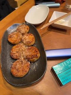 大阪旅行④ 酔いざましで歩きながらたどり着いたとこは前回来た時にお休みで入れなかったお店🏢 着いたら2組待ってたから外で並んで待って20分くらいしたら入れた🙌 わさび菜の漬け物とサザエのつぼ焼きでチビチビつまみながら喋っててそろそろお寿司食べようか~って日本酒も🍶 この日本酒頼むとこのおちょこもらえたんだ🙌 初めてのお店のウニは毎回ドキドキしながら食べるんだけどここの大丈夫だった👏 穴子もフワフワだったし🤤 最後はとろたく(*´艸`*) どれもこれも美味しかったしおつまみメニューもいっぱいあったからここはまた行きたいな~🎶 お腹いっぱいになってまた酔い醒ましに歩いてホテルに戻ったよ🏠 続く✋