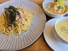 お休みの日にランチしてきた(*´艸`*) ツナおろしパスタ🍝 このコーンスープが濃くて美味しかった🤤 コーンスープ飲むとあさくま行きたくなるんだよな~🌽